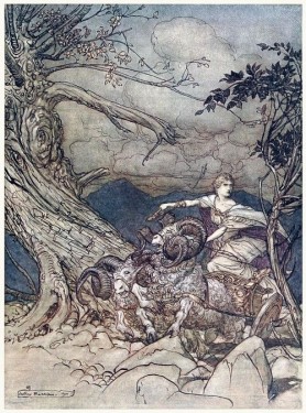 Fricka en su carro tirado por carneros. Arthur Rackham